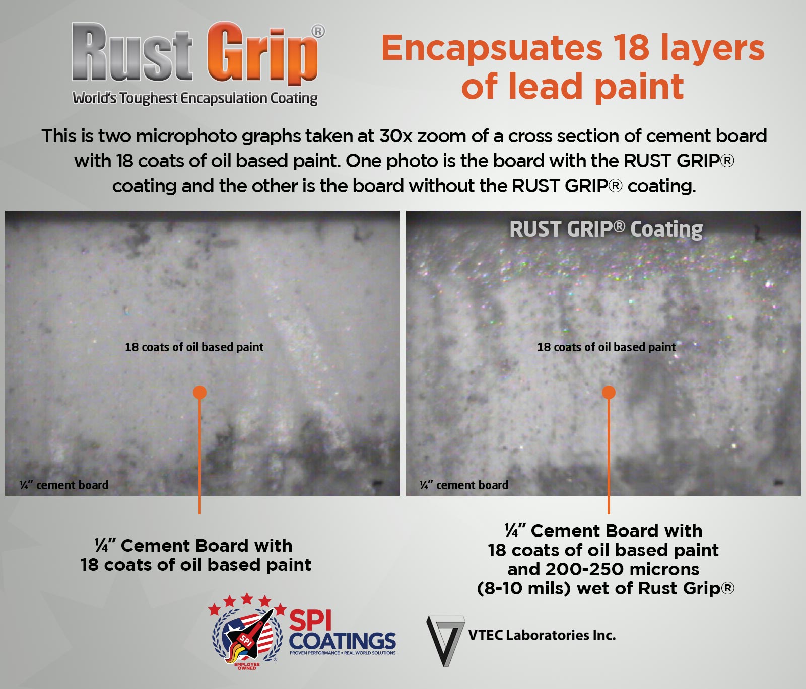 | Performance | • Limited Performance • Cannot match Rust Grip®'s Laboratory or field performance | Perfect Score: • ASTM B117 Salt Spray Fog Test: 15,000 hours = 30 years • ASTM D5894 Standard Practice for Cyclic Salt Fog/UV Exposure of Painted Metal; 10,000 hours • ASTM E1795 Standard Specification for Non-Reinforced Liquid Coating Encapsulation Products for Leaded Paint in Buildings |