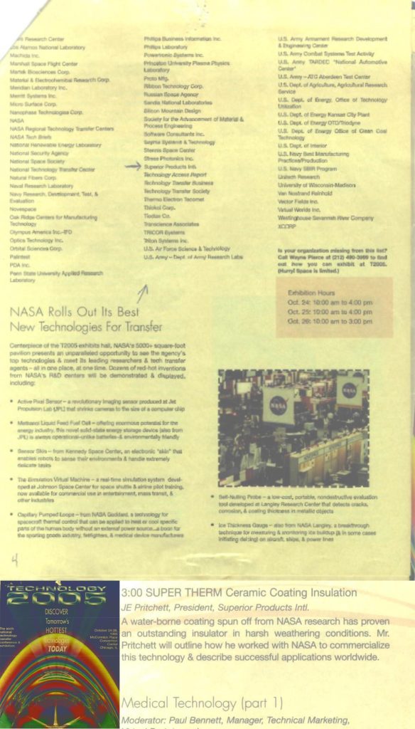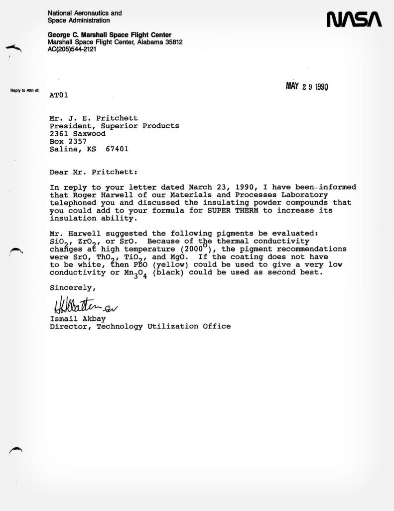 Over a period of six years, Pritchett tested every compound on the lists NASA provided, whittling down the potential compounds until he found the perfect insulation. Pritchett founded Superior Products International II Inc. or Shawnee. Kansas, in 1995. The product, dubbed Super Therm®, is a composite of both ceramic and polymeric materials. The ceramic acts as the primary heat reflector and heat insulation, while the polymer is more of a heat and environmental-resistant binding agent.