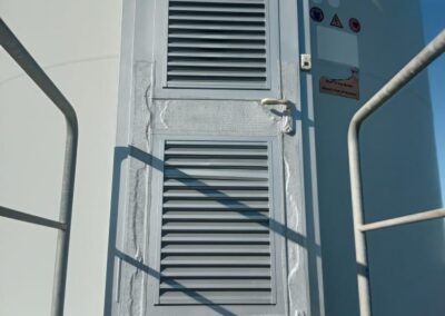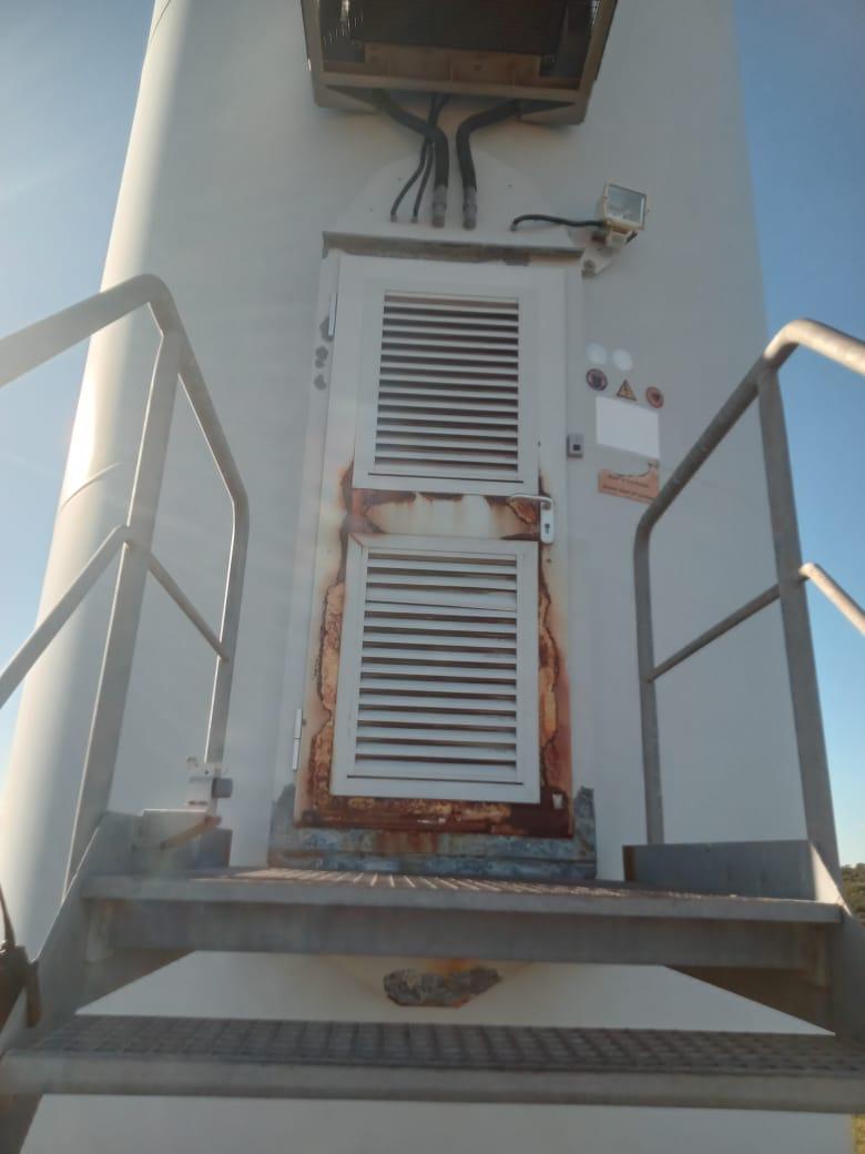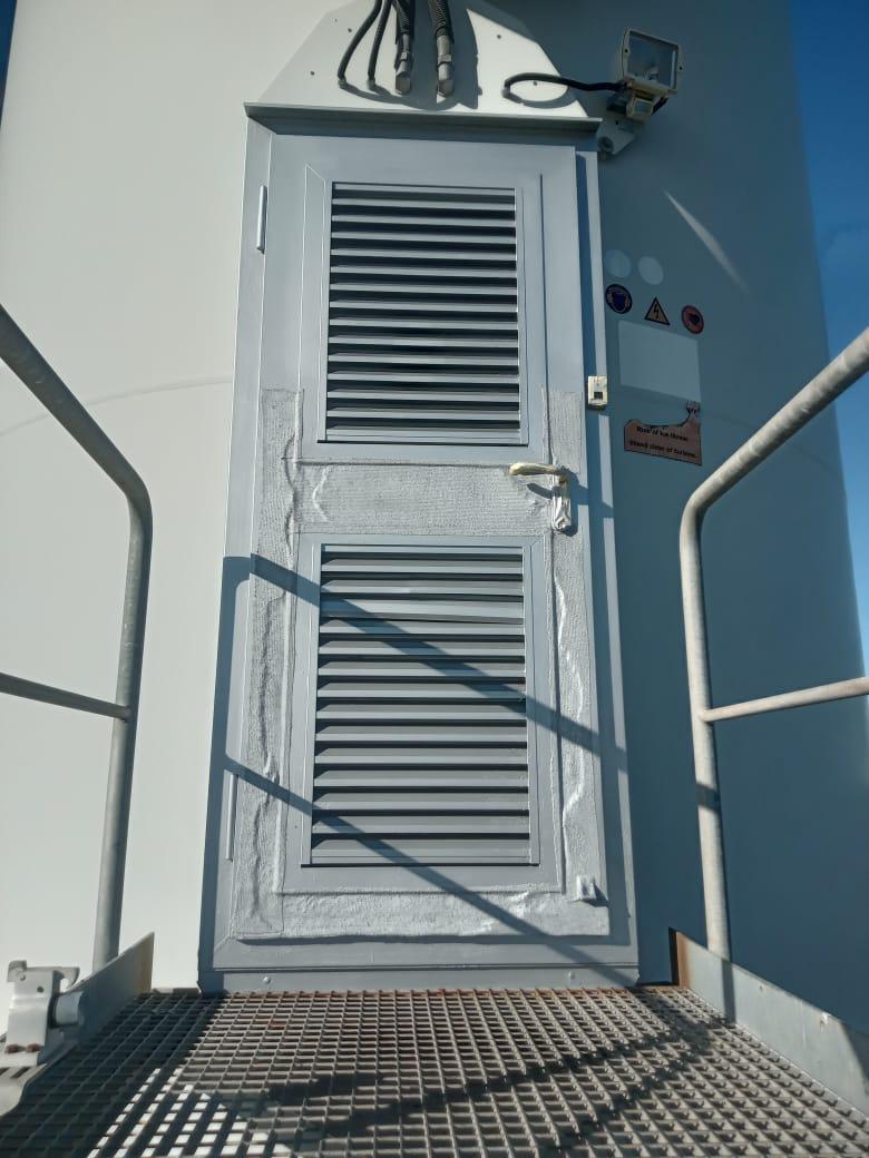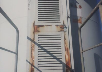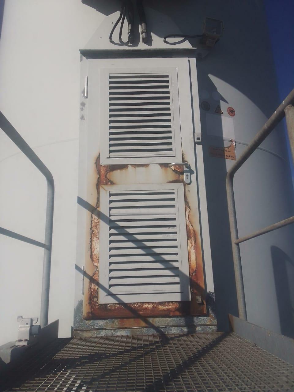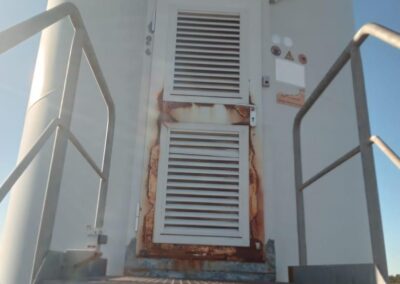 The project addressed corrosion deterioration on the tower base flange, door frames, ventilation panels, and associated structural steel components. Environmental exposure, coastal conditions, and moisture retention had resulted in visible rust formation and coating breakdown, particularly around bolted flange connections and access doors.
