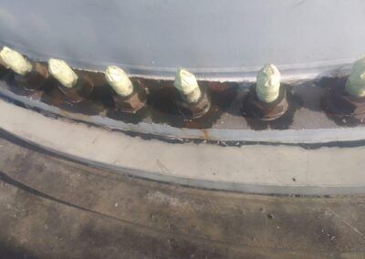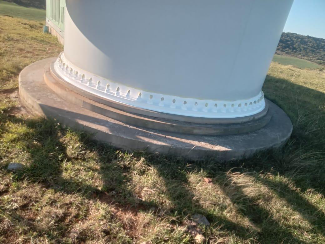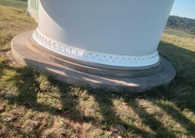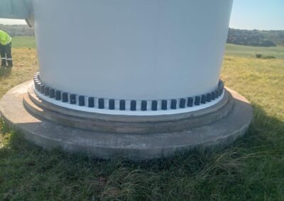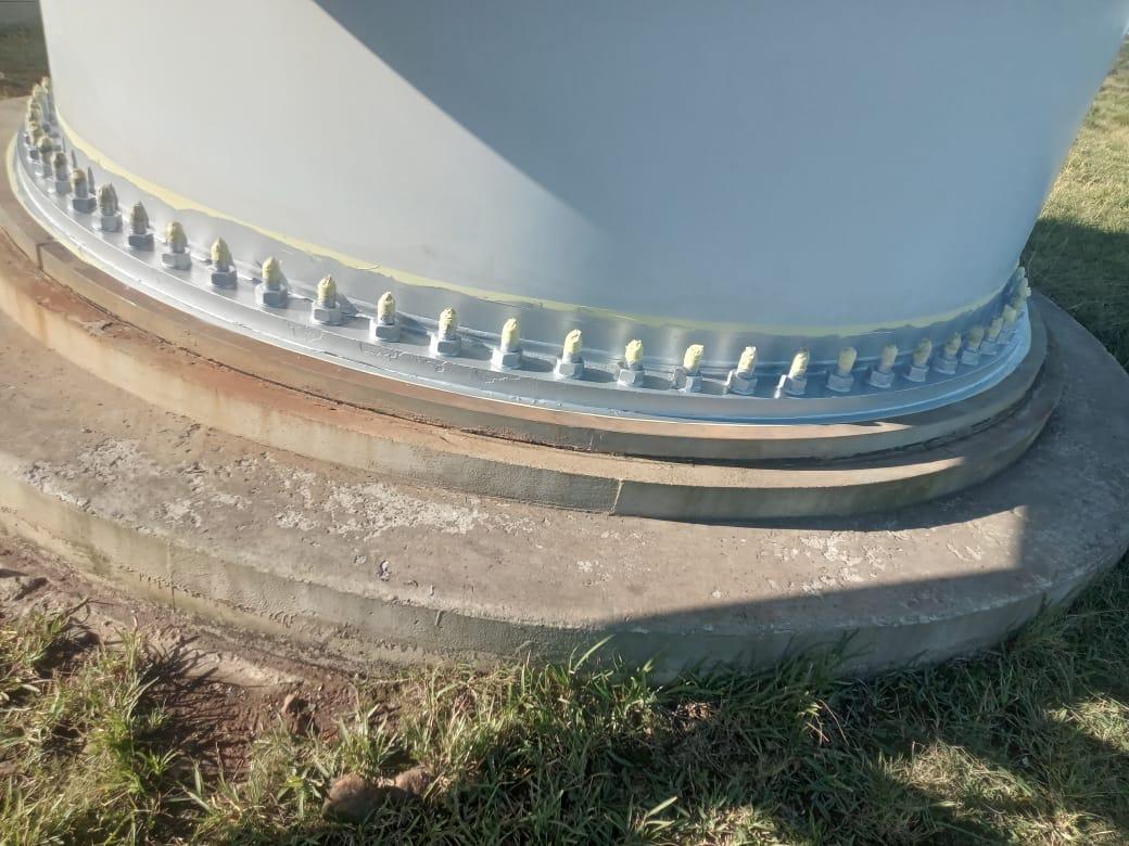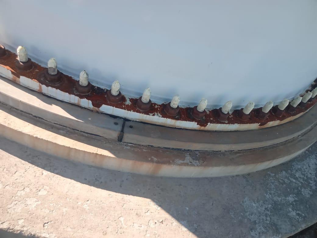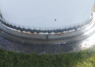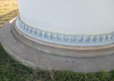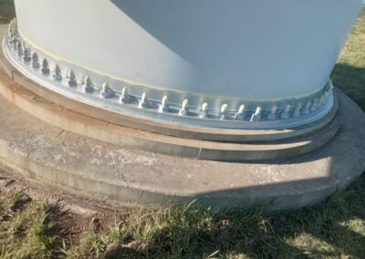 Upon inspection, corrosion was evident around the tower base ring, anchor bolt areas, and door perimeters. The solution required complete remediation and encapsulation to prevent further deterioration.