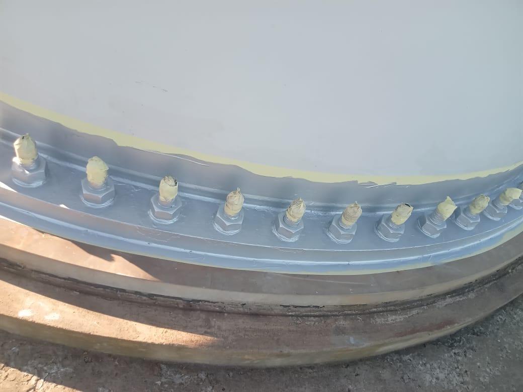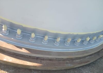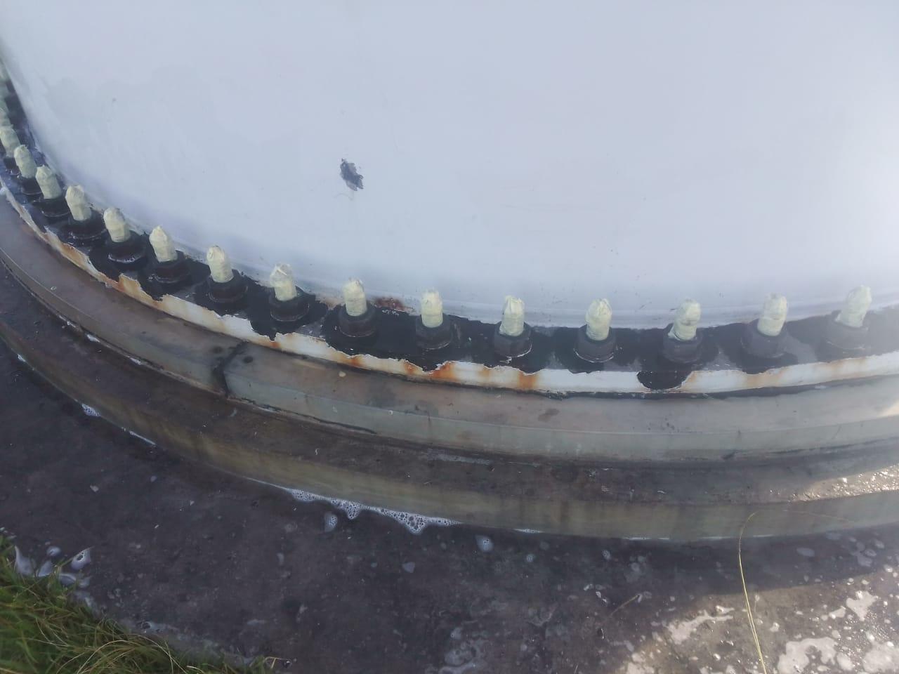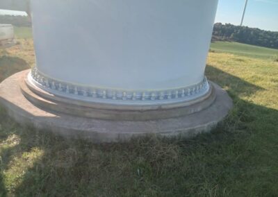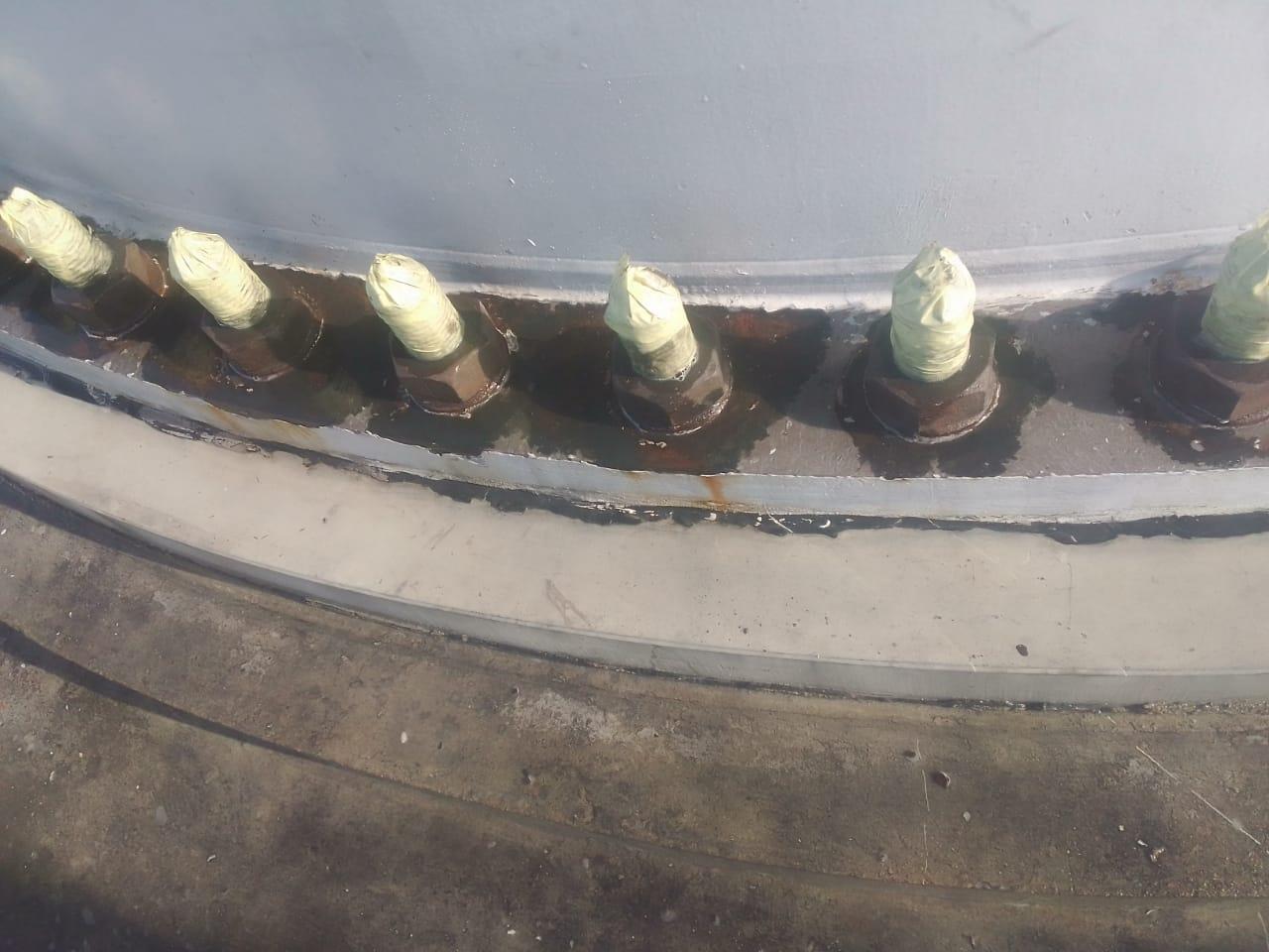 Upon inspection, corrosion was evident around the tower base ring, anchor bolt areas, and door perimeters. The solution required complete remediation and encapsulation to prevent further deterioration.